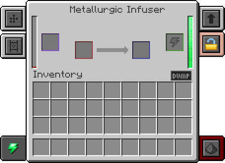 The Metallurgic Infuser is a machine added by Mekanism. It is used to infuse one substance into another. It is an important machine because it produces components which are required for other machines and items in Mekanism. For example, it transforms Iron Ingots into Enriched Iron and further into Steel using Coal. The machine is also used as a component to craft the Basic Infusing Factory.