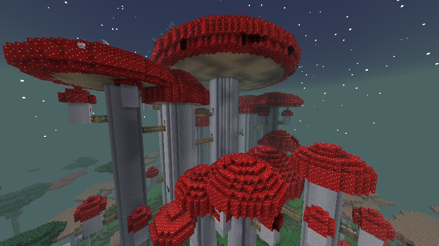 The Mushroom Castle is a landmark from the Twilight Forest mod. They can be found in Lots of Mushrooms biomes, and are currently Work In Progress. In the current version of Twilight Forest, they do not contain anything.