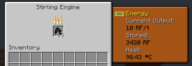 The Stirling Engine, formerly called the Steam Engine, is the second tier of engine in BuildCraft and provides 10 Redstone Flux per tick (RF/t).