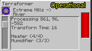 Once all required modules are ready, the Terraformer will begin the slow process of changing the biome. When active, the module antenna(s) will glow colorfully. The Terraformer does not convert blocks, it only changes the Biome data associated with the coordinates in the specified area.