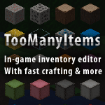 TooManyItems does not require any other mod to run, but Modloader is needed for unlimited items prior to Minecraft version 1.8. When playing, there is a menu that appears when a player opens their inventory, displaying all blocks and items, including ones not obtainable in Creative mode (including fire, End Portal frames, and all other entities that cannot be obtained in vanilla Minecraft). Left-clicking an item/block in the menu will instantly place a stack of it in the player's inventory, shift left-clicking will place an infinite stack (displayed as 111 units in a stack) in the inventory, and right-clicking will place one copy of the item in the inventory. From TooManyItems version 1.0.0, players can change between creative and survival modes, change the time from dawn, noon, dusk, and midnight, and toggle rain/snow with the toolbar at the top. In newer versions, every tool is located to the right of the inventory. If this feature is unwanted it can be disabled by opening the mod's config file and setting itemsonly:false to itemsonly:true. Right-clicking on the output square when crafting will craft the maximum possible amount of the recipe based on the number of items placed in the input slots. Shift-clicking an item in the inventory transfers it to the other opened inventory without dragging it, though this feature was already put in vanilla Minecraft around the Adventure Update.