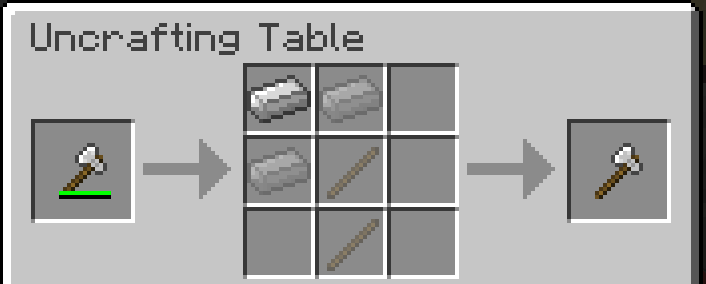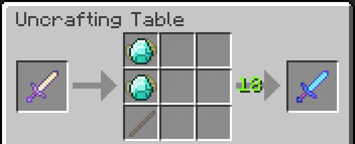 When uncrafting damaged tools or weapons, sometimes there may be empty grid squares. This is because the tool is damaged, but they can be repaired. For an example, if an Iron Pickaxe has taken enough damage, the uncrafting process will yield 2 Sticks and 1 Iron Ingot. Through repairing, once can place two ingots where they should be, and the output will return a fully repaired item, along with the enchantments if there are any. This process only applies to tools and armor that can be uncrafted, so if it cannot be crafted, it cannot be repaired on an Uncrafting Table.