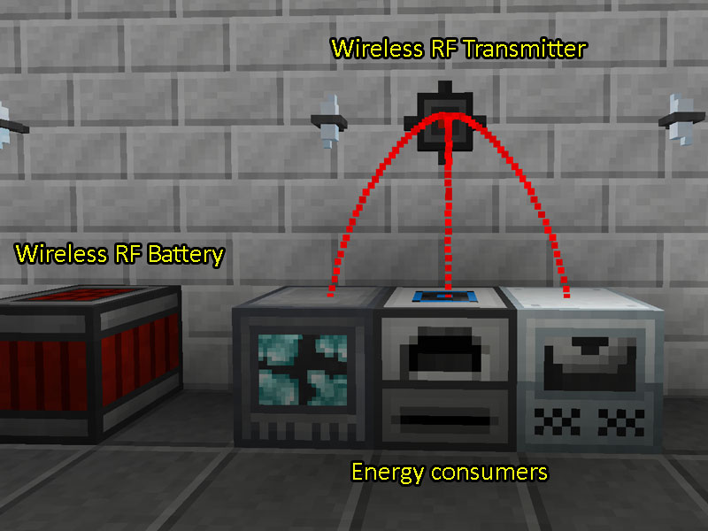 The Wireless RF Transmitter draws Redstone Flux energy from a Wireless RF Battery and distributes the power wirelessly to energy consumers within a 4 block radius. The transfer is limited to 80 RF/t per connection and consumes 1 GP each. When right-clicked, the Wireless RF Transmitter will briefly display red particles to indicate connections to energy consumers and display the total number of connections in chat.